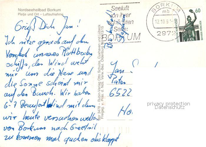 72936665 alte Postkarte BORKUM Nordseebad Niedersachsen Platje und Ort Fliegeraufnahme postalisch gelaufen Erhaltung siehe scans [FriedD77] KatCode: 11110003457002