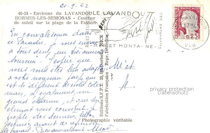 13531807 carte postale Bormes-les-Mimosas Coucher de soleil sur la plage de la Faviere postalisch gelaufen Erhaltung siehe scans [WerneD78] KatCode: 11170083283019
