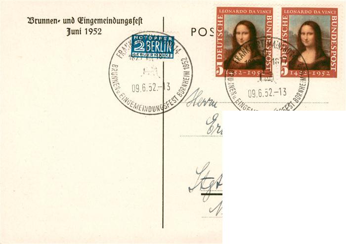 73890076 alte Postkarte Bornheim Hessen Frankfurt Main Brunnen und Eingemeindungsfest 1952 postalisch gelaufen Erhaltung siehe scans [WerneD78] KatCode: 11110006412000