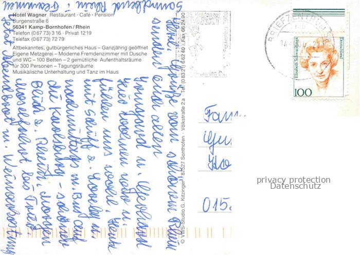 74043600 alte Postkarte Bornhofen Kamp Rhein Hotel Wagner Restaurant Café Blick ueber den Rhein Faehren postalisch gelaufen Erhaltung siehe scans [FriedD77] KatCode: 11110007141066