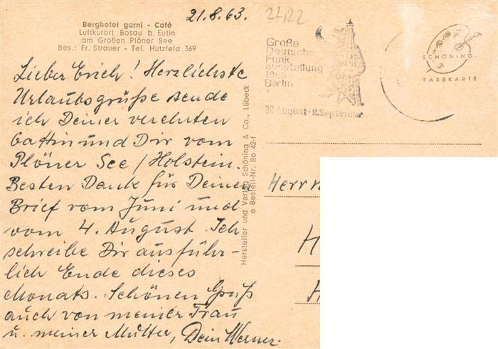73940329 alte Postkarte Bosau Ostholstein Berghotel garni Cafe postalisch gelaufen Erhaltung siehe scans [FriedD77] KatCode: 11110001055007