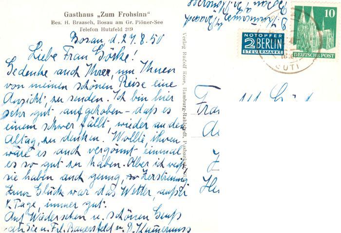 73868444 alte Postkarte Bosau Ostholstein Blick ueber den Bischofssee Grosser Ploener See Vicelin-Kirche 12. Jhdt. postalisch gelaufen Erhaltung siehe scans [FriedD77] KatCode: 11110001055007