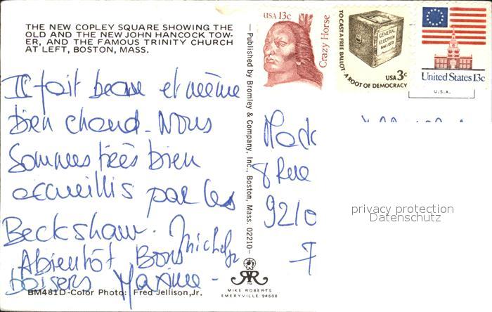 72492529 old postcard Boston Massachusetts Coplec Square und Trinity Church postalisch gelaufen Erhaltung siehe scans KatCode: 14140230000000