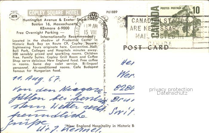 12020848 old postcard Boston Massachusetts Copley Square Hotel postalisch gelaufen Erhaltung siehe scans KatCode: 14140230000000