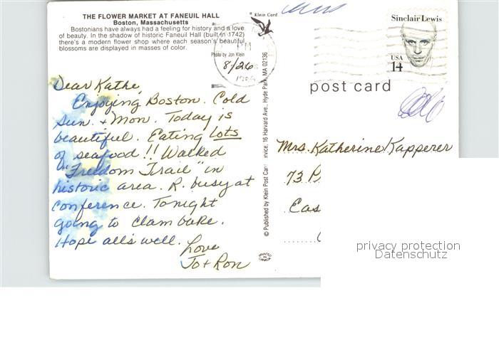 72502781 old postcard Boston Massachusetts Flower-Market postalisch gelaufen Erhaltung siehe scans KatCode: 14140230000000