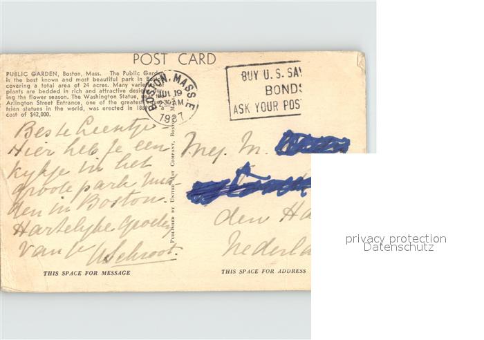 72431705 old postcard Boston Massachusetts George Washington Monument postalisch gelaufen Erhaltung siehe scans KatCode: 14140230000000