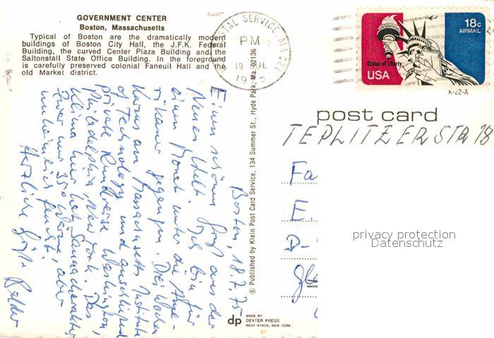 72897243 old postcard Boston Massachusetts Government Center postalisch gelaufen Erhaltung siehe scans [AndreD76] KatCode: 14140230000000