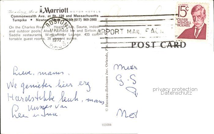 72259271 old postcard Boston Massachusetts Marriott Motor Hotel at night postalisch gelaufen Erhaltung siehe scans KatCode: 14140230000000