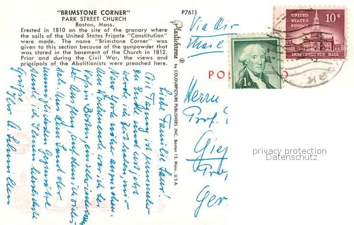 73256650 old postcard Boston Massachusetts Park Street Church postalisch gelaufen Erhaltung siehe scans [NatalD47] KatCode: 14140230000000