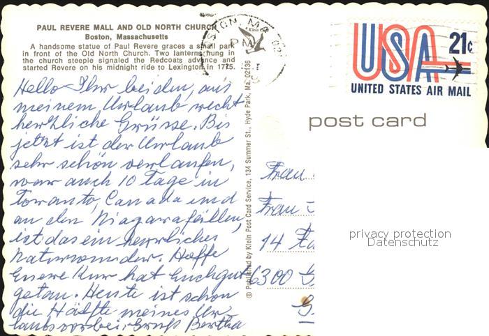 72456705 old postcard Boston Massachusetts Paul Revere Mall Old North Church postalisch gelaufen Erhaltung siehe scans KatCode: 14140230000000
