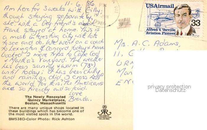 73127847 old postcard Boston Massachusetts Quinca Marktplatz postalisch gelaufen Erhaltung siehe scans [KathaD81] KatCode: 14140230000000
