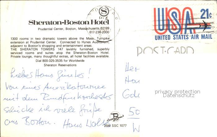 72475612 old postcard Boston Massachusetts Sheraton Boston Hotel postalisch gelaufen Erhaltung siehe scans KatCode: 14140230000000