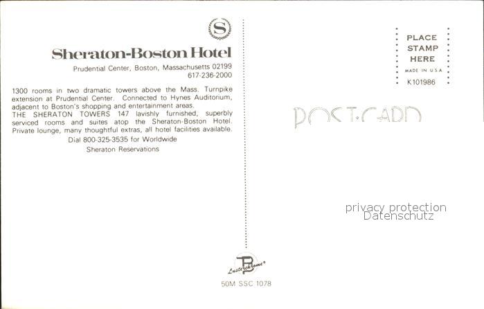 72252999 Boston Massachusetts Sheraton Boston Hotel postalisch nicht gelaufen Erhaltung siehe scans KatCode: 14140230000000