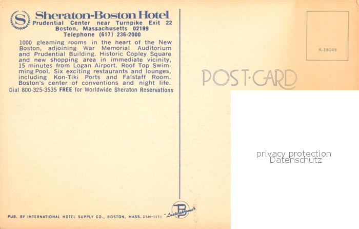 72944109 Boston Massachusetts Sheraton Boston Hotel postalisch nicht gelaufen Erhaltung siehe scans [WerneD78] KatCode: 14140230000000