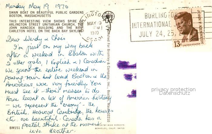 73126080 old postcard Boston Massachusetts Swan Boat John Handcock Building postalisch gelaufen Erhaltung siehe scans [KathaD81] KatCode: 14140230000000