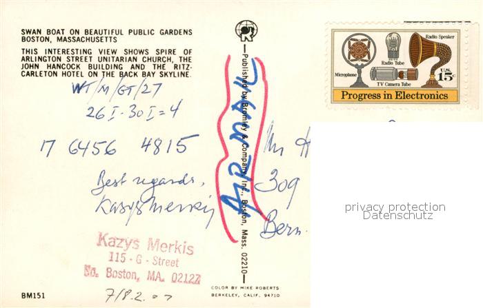 72986770 Boston Massachusetts Swan Boat on Public Gardens Unitarian Church John Hancock Building Ritz Carleton Hotel postalisch nicht gelaufen Erhaltung siehe scans [FriedD77] KatCode: 14140230000000