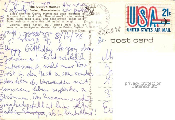 72890549 old postcard Boston Massachusetts The Quincy Market and Faneuil Hall postalisch gelaufen Erhaltung siehe scans [WerneD78] KatCode: 14140230000000