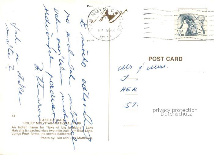 73171200 old postcard Boulder Colorado Lake Haiyaha Rocky Mountain National Park postalisch gelaufen Erhaltung siehe scans [NatalD47] KatCode: 14140060000000
