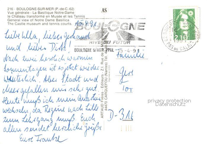 13747982 Boulogne-sur-Mer 62 Vue generale aerienne La Basilique Notre Dame le Chateau transforme en Musee et les Tennis postalisch gelaufen Erhaltung siehe scans [WerneD78] carte postale Wern Katcode 11170062362160
