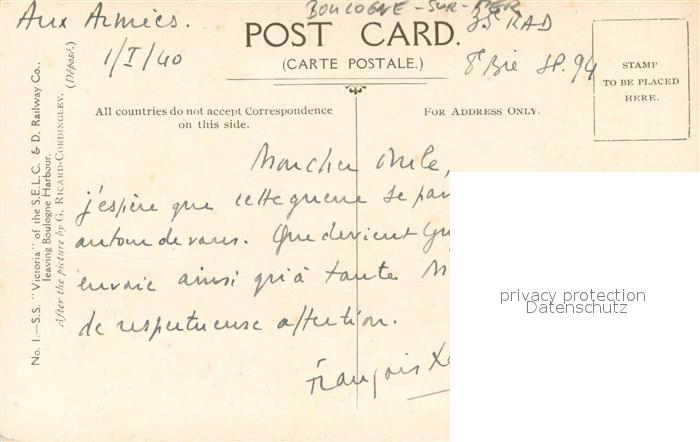 13638563 Boulogne-sur-Mer Départ du port de ss Victoria Peinture Ricard Cordingley Kuenstlerkarte postalisch nicht gelaufen Erhaltung siehe scans [FriedD77] Frie Katcode 11170062362160