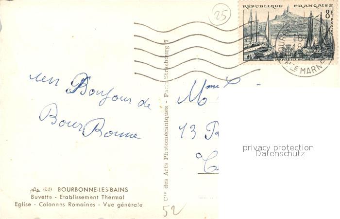 13506379 carte postale Bourbonne-les-Bains Buvette Etablissement Thermal Eglise Colonnes Romaines vue Generale postalisch gelaufen Erhaltung siehe scans [FriedD77] KatCode: 11170052252060