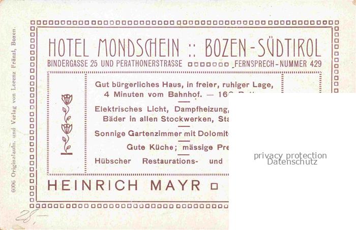 74059046 old postcard Bozen BOLZANO Suedtirol IT Hotel Mondschein Kuenstlerkarte postalisch gelaufen Werbekarte (keine Postkarte) Erhaltung siehe scans [FriedD77] KatCode: 11240