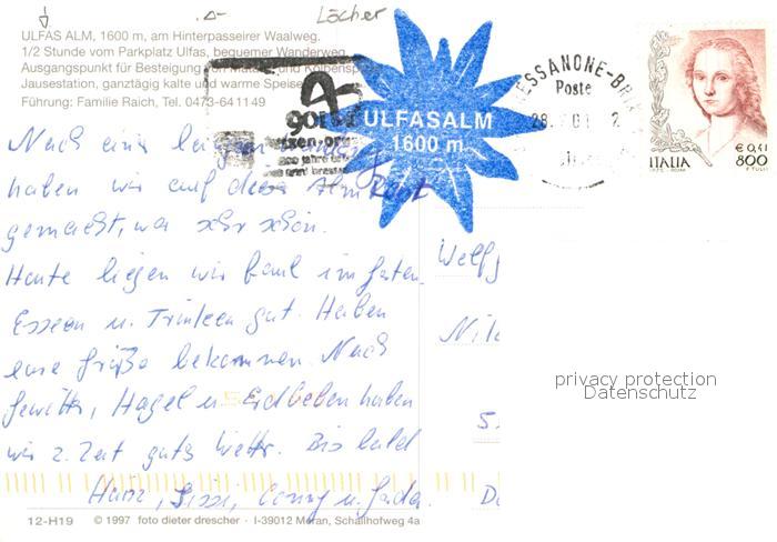 old postcard Bozen Suedtirol Ulfas Alm Hinterpasseirer Waalweg postalisch gelaufen Erhaltung siehe scans [NatalD47]