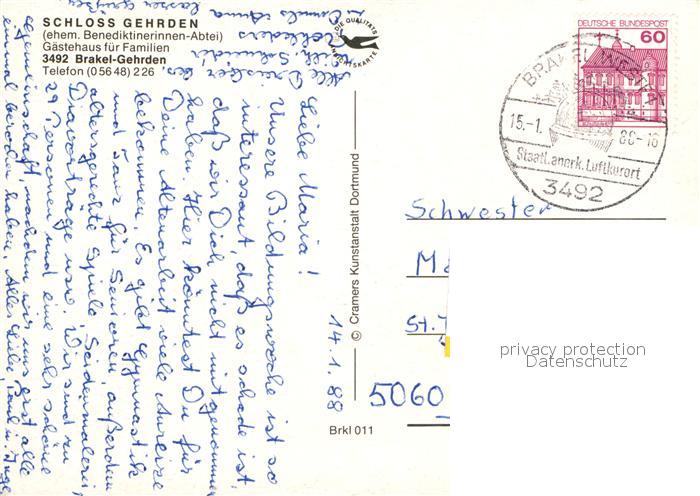 73008821 alte Postkarte Brakel Westfalen Schloss Gehrden postalisch gelaufen Erhaltung siehe scans [WerneD78] KatCode: 11110005762016