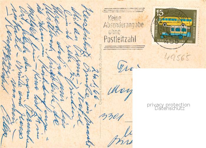 73853588 alte Postkarte Bramsche Hase Grosse Strasse Bahnhof Ratsschaenke Ehrenmal Mittelschule Strandbad postalisch gelaufen Erhaltung siehe scans [WerneD78] KatCode: 11110003459014
