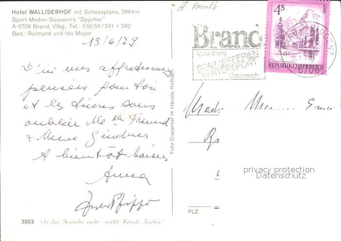 71708977 alte Postkarte Brand Vorarlberg Hotel Walliserhof mit Schesaplana postalisch gelaufen Erhaltung siehe scans KatCode: 11390341080105