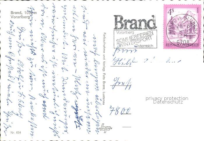 71812730 alte Postkarte Brand Vorarlberg Ortsblick vom Wegekreuz Ruhebank postalisch gelaufen Erhaltung siehe scans KatCode: 11390341080105