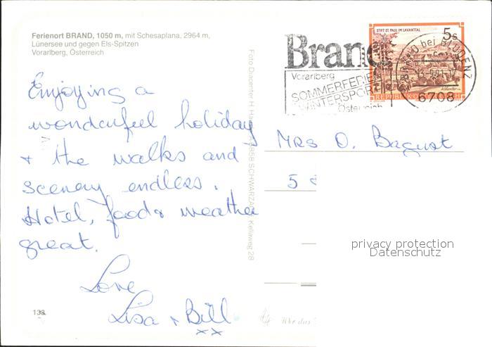 72235784 alte Postkarte Brand Vorarlberg Panorama mit Schesaplana Lunersee und Els Spitzen postalisch gelaufen Erhaltung siehe scans KatCode: 11390341080105