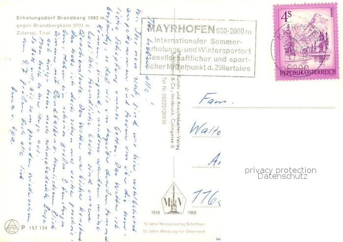 73071950 alte Postkarte Brandberg Tirol Teilansicht Erholungsort gegen Brandbergkolm Zillertaler Alpen postalisch gelaufen Erhaltung siehe scans [FriedD77] KatCode: 11390335070903