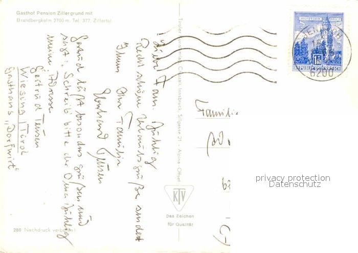 72678792 alte Postkarte Brandbergerkolm Zillertal Gasthaus Pension Zillergrund postalisch gelaufen Erhaltung siehe scans [LiesaD40] KatCode: 11390