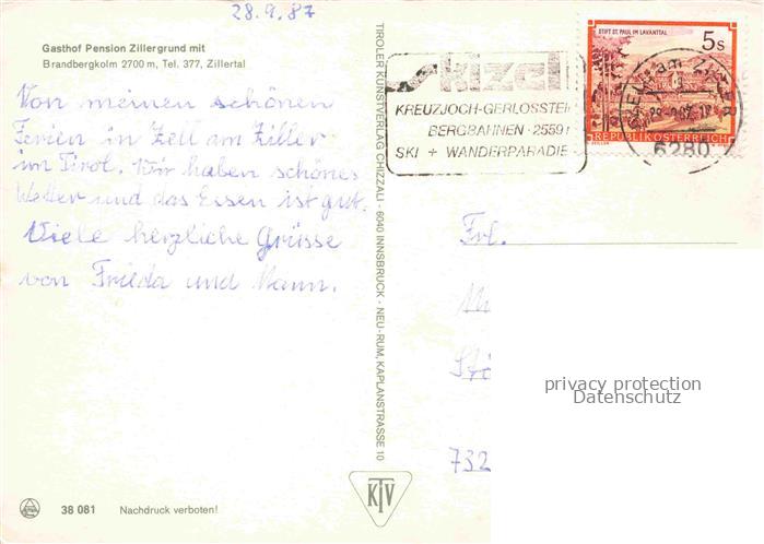 74152565 alte Postkarte Brandbergkolm 2701m Zillertal Tirol AT Gasthof Zillergrund mit Brandbergkolm postalisch gelaufen Erhaltung siehe scans [WerneD78] KatCode: 22440000005700