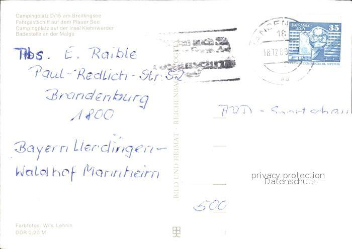 72401231 alte Postkarte Brandenburg Havel Campingplatz Breitlingsee Insel Kiehnwerder Badestelle Malge postalisch gelaufen Erhaltung siehe scans KatCode: 11110012051000