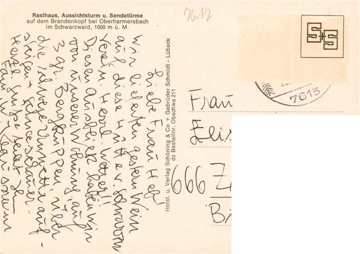 73931069 alte Postkarte Brandenkopf Rasthaus Aussichtsturm und Sendetuerme postalisch gelaufen Erhaltung siehe scans [FriedD77] KatCode: 11110008317088