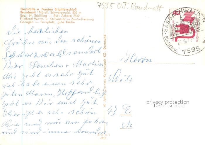 73870491 alte Postkarte Brandmatt Sasbachwalden Fliegeraufnahme Gaststaette Pension Brigitten Schloss Gastraeume Zimmer postalisch gelaufen Erhaltung siehe scans [WerneD78] KatCode: 11110008317118
