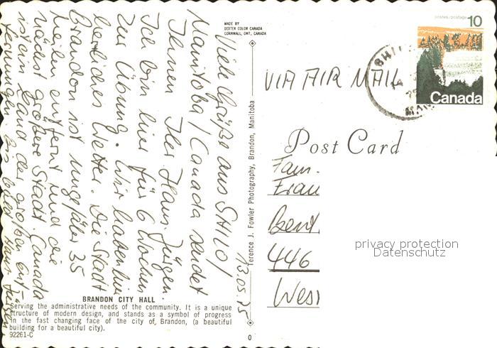 old postcard Brandon Manitoba City Hall postalisch gelaufen Erhaltung siehe scans