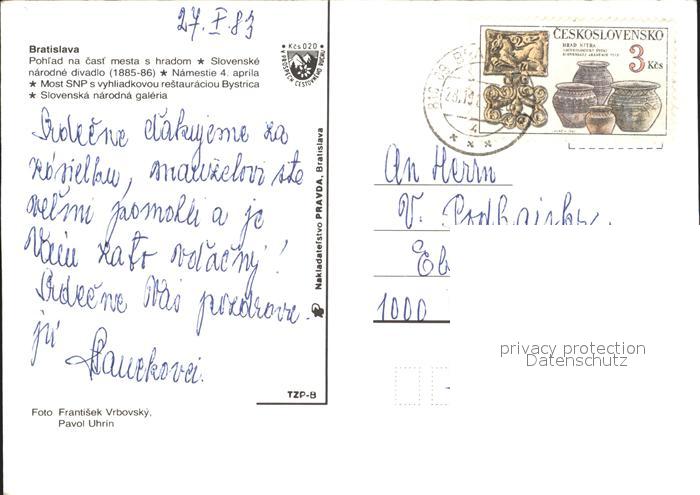 old postcard Bratislava Pressburg Pozsony Panorama Slovenske narodne divadio Namestie 4 aprila Most SNP restauraciou Bystrica Slovenska narodna galeria postalisch gelaufen Erhaltung siehe scans