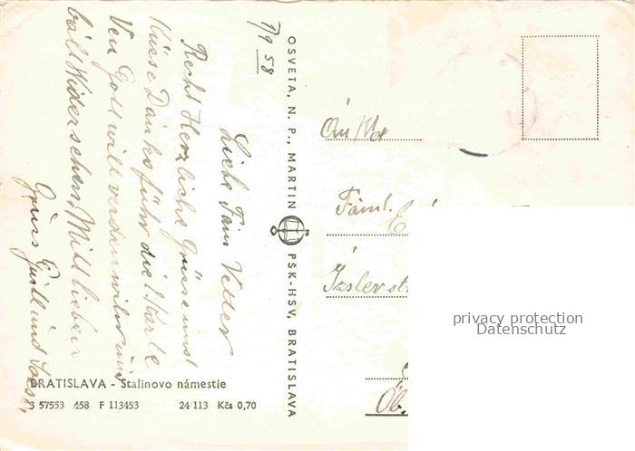 34143557 old postcard BRATISLAVA Pressburg Pozsony SK Stalinovo namestie postalisch gelaufen Erhaltung siehe scans [FriedD77] KatCode: 11490