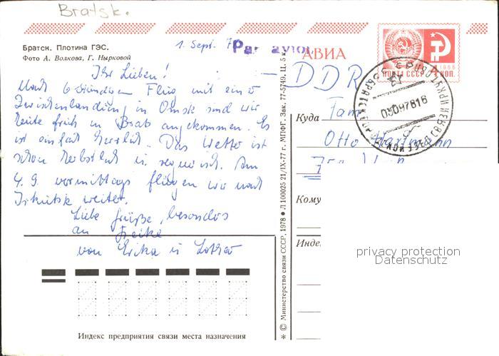 old postcard Bratsk Talsperre postalisch gelaufen Ganzsache (eingedruckte Briefmarke) Erhaltung siehe scans