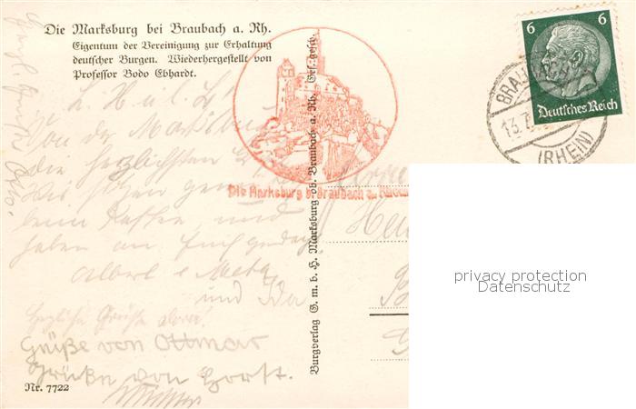 73810749 alte Postkarte Braubach Rhein Die Marksburg postalisch gelaufen Erhaltung siehe scans [WerneD78] KatCode: 11110007141501