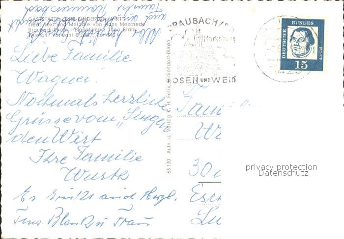 72117582 alte Postkarte Braubach Rhein Gaststaette Zum Singenden Wirt postalisch gelaufen Erhaltung siehe scans KatCode: 11110007141501