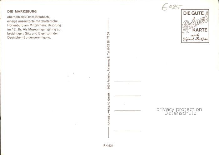72298756 Braubach Rhein Marksburg postalisch nicht gelaufen Erhaltung siehe scans KatCode: 11110007141501