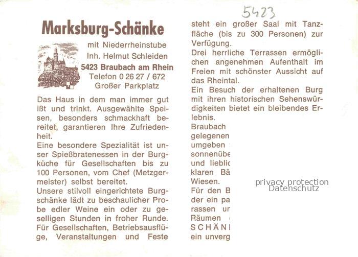 74050867 Braubach Rhein Marksburg-Schaenke Gastraeume Grill postalisch nicht gelaufen Werbekarte (keine Postkarte) Erhaltung siehe scans [WerneD78] KatCode: 11110007141501