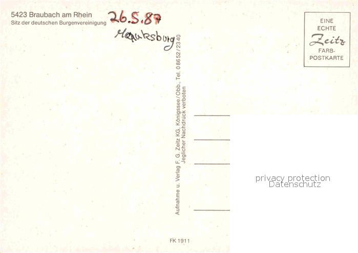 72913681 Braubach Rhein Sitz der deutschen Burgenvereinigung Rittersaal Kemenate Ritterruestungen Burgkueche postalisch nicht gelaufen Erhaltung siehe scans [LiesaD40] KatCode: 11110007141501