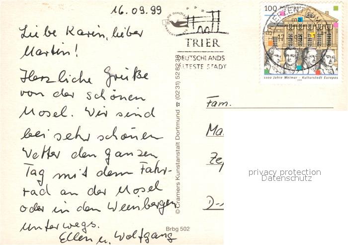 73176019 alte Postkarte Brauneberg Panorama Moseltal Naturdenkmal Kirche Klosterturm Weinbergsfass Weinberge postalisch gelaufen Erhaltung siehe scans [FriedD77] KatCode: 11110007231012