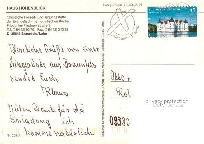 73730681 alte Postkarte Braunfels Freizeit- und Tagungsstaette Haus Hoehenblick Fremdenzimmer Kapelle postalisch gelaufen Erhaltung siehe scans [FriedD77] KatCode: 11110006532003