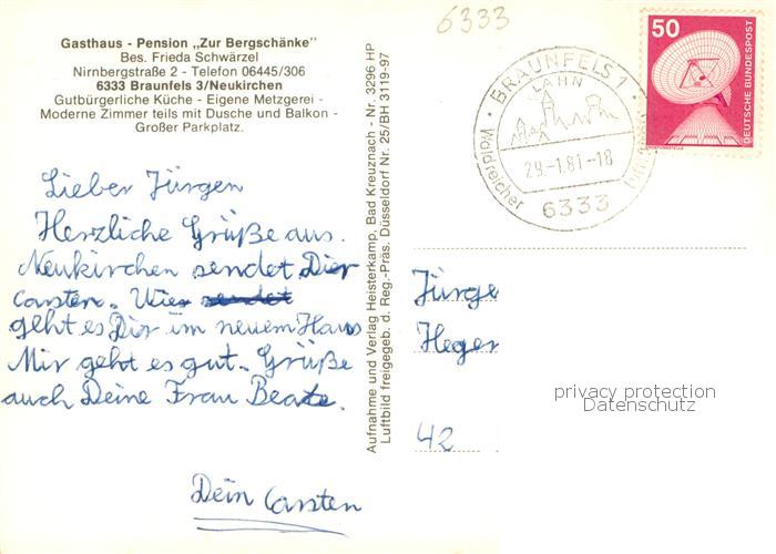 73759282 alte Postkarte Braunfels Gasthaus Pension Zur Bergschaenke Gastraeume Kegelbahn postalisch gelaufen Erhaltung siehe scans [FriedD77] KatCode: 11110006532003